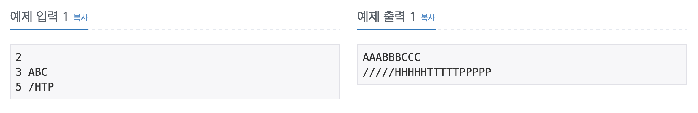 문자열 S를 입력받은 후에, 각 문자를 R번 반복해 새 문자열 P를 만든 후 출력하는 프로그램을 작성하시오. 즉, 첫 번째 문자를 R번 반복하고, 두 번째 문자를 R번 반복하는 식으로 P를 만들면 된다. S에는 QR Code "alphanumeric" 문자만 들어있다.