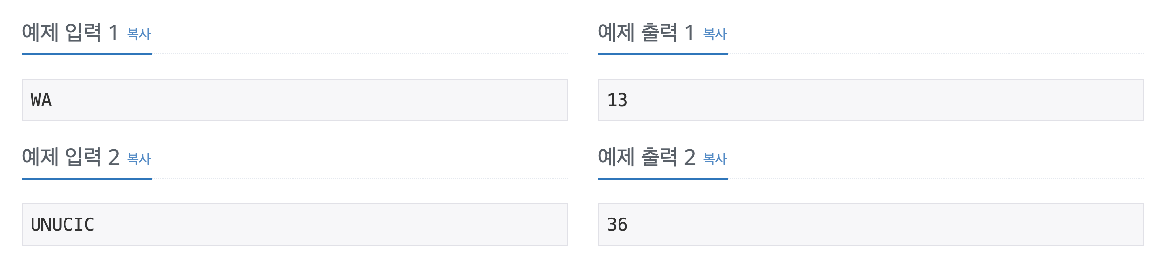 첫째 줄에 알파벳 대문자로 이루어진 단어가 주어진다. 단어의 길이는 2보다 크거나 같고, 15보다 작거나 같다.