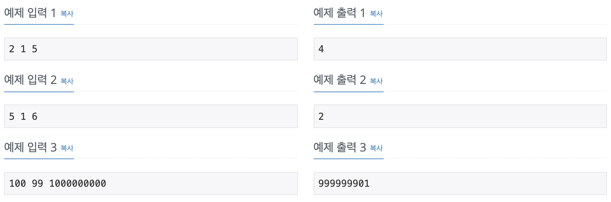 첫째 줄에 세 정수 A, B, V가 공백으로 구분되어서 주어진다. (1 ≤ B < A ≤ V ≤ 1,000,000,000)