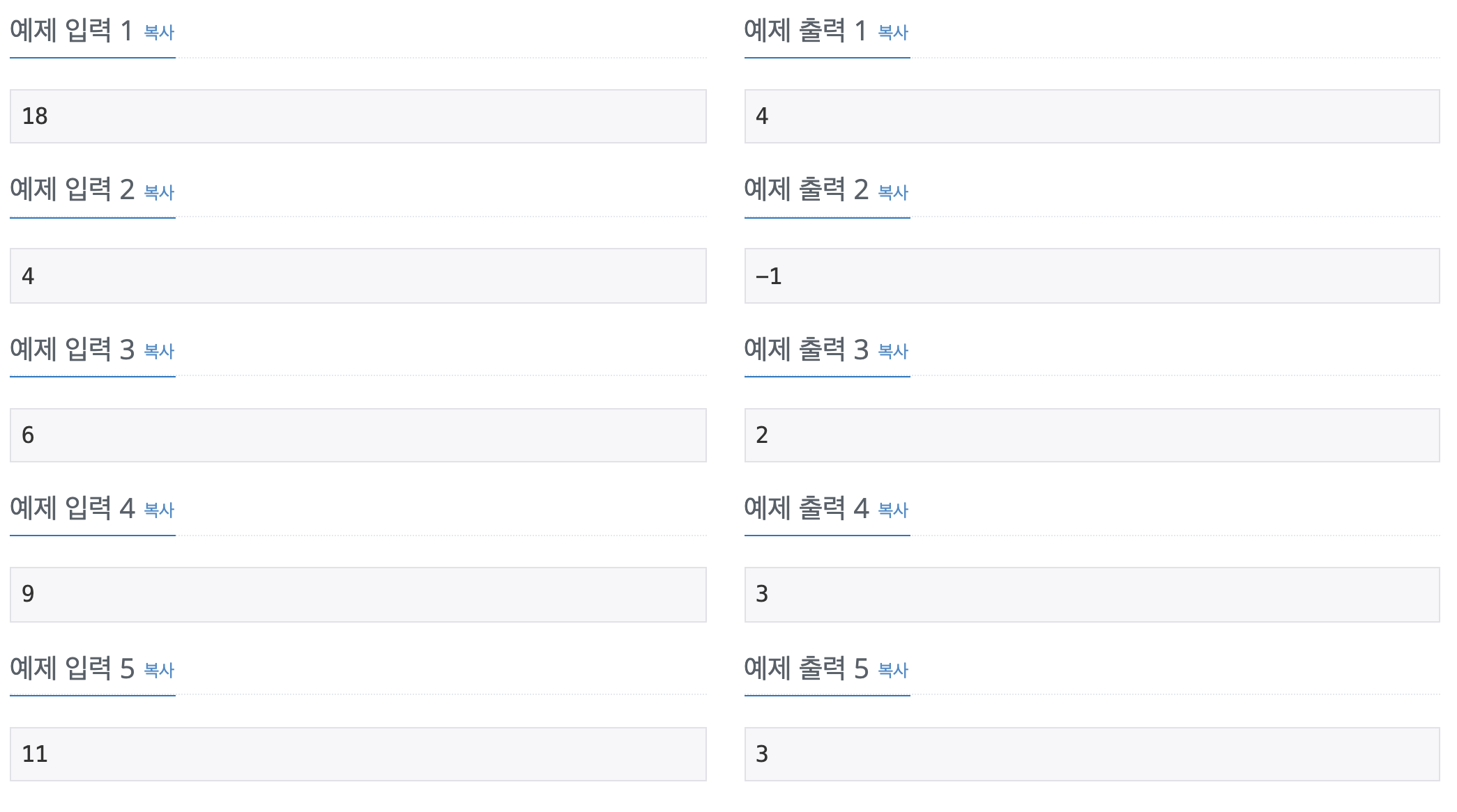 상근이가 배달하는 봉지의 최소 개수를 출력한다. 만약, 정확하게 N킬로그램을 만들 수 없다면 -1을 출력한다.