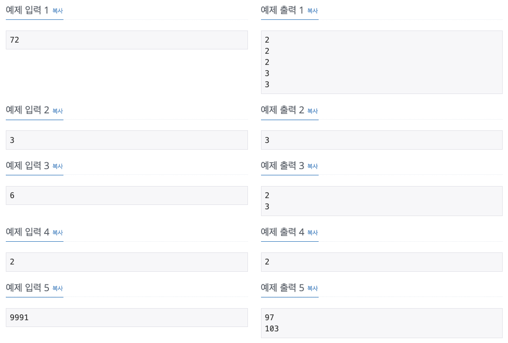 num = int(input()) i = 2 - while문을 통해 num이 1을 초과하는 경우, num을 i로 나눌 수 있는 경우, i로 나눈 뒤, i를 출력하고, i로 나눌 수 없는 경우 i에 1을 더해주어 3, 4, 5 ... 가 차례대로 오게한다.