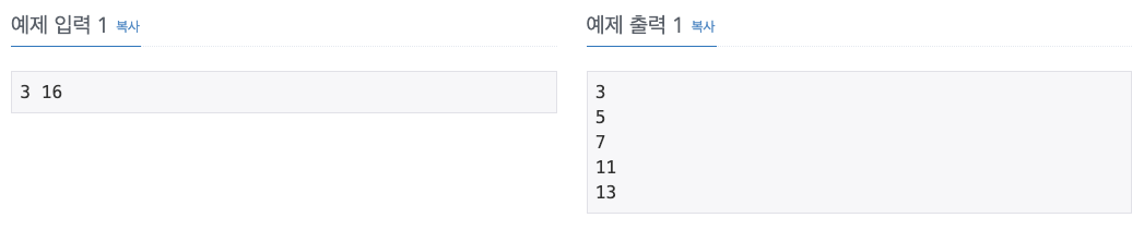 첫째 줄에 자연수 M과 N이 빈 칸을 사이에 두고 주어진다. (1 ≤ M ≤ N ≤ 1,000,000) M이상 N이하의 소수가 하나 이상 있는 입력만 주어진다.