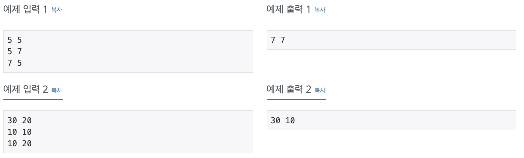 세 점이 주어졌을 때, 축에 평행한 직사각형을 만들기 위해서 필요한 네 번째 점을 찾는 프로그램을 작성하시오.