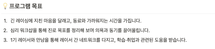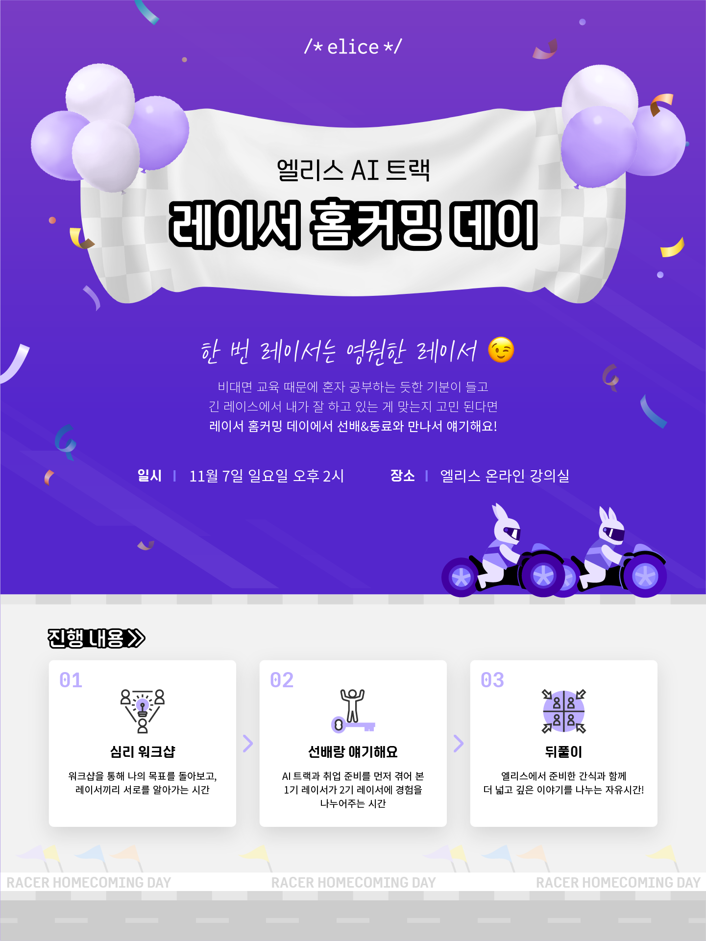 비대면으로 인해 혼자 묵묵히 앞으로 나아가야하는 상황 속에서, 다른 레이서들과 자유롭게 소통하고, 심리 상담도 받아볼 수 있으며, 엘리스 AI 트랙 1기 선배님들과 온라인을 통해 만날 수 있는 "레이서 홈 커밍 데이"를 엘리스에서 만들어 주었다.