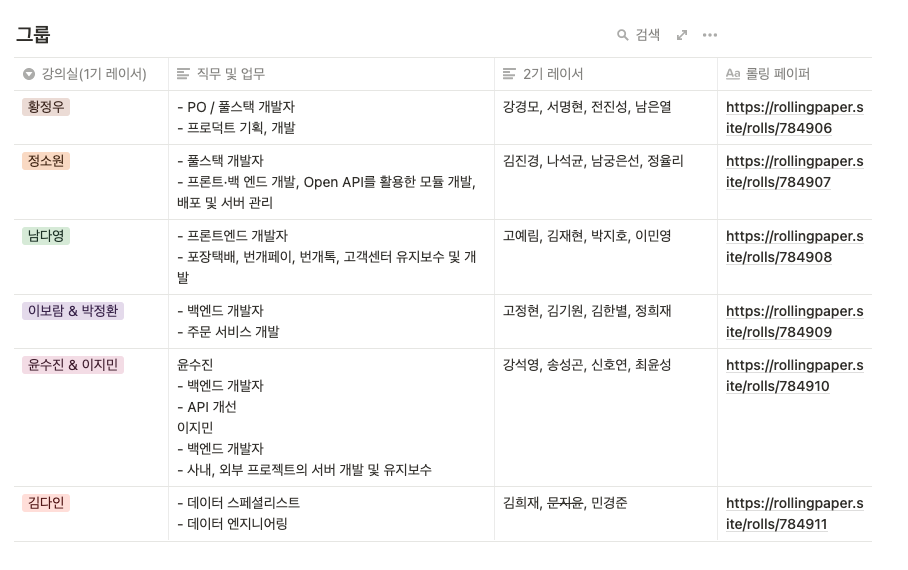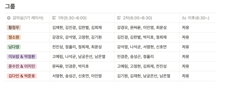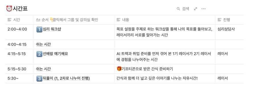 해당 뒤풀이 시간은 1차, 2차로 나누어 그룹을 구성했고, 최대한 자유로운 대화가 오갈 수 있도록 멤버를 구성해주었다.