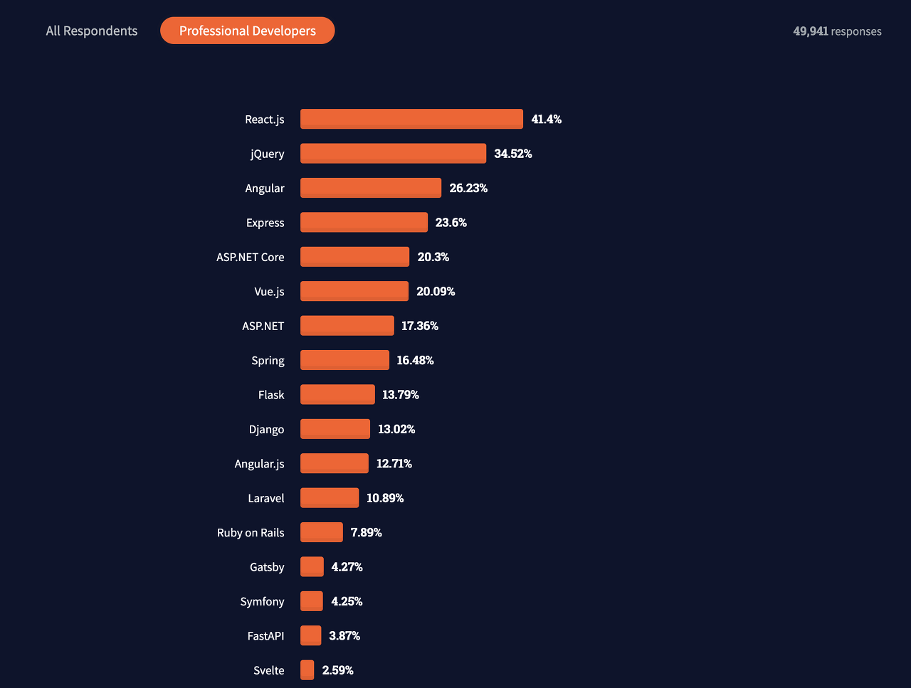 2021년 StackOverFlow에서 조사한 웹 프레임워크 사용 순위에서 react.js가 1위를 했다. vue의 사용이 증대되고 있지만 아직까지 크게 순위적인 차이가 나지 않은 것 같다.