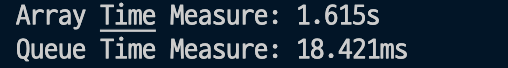 하지만 데이터를 제거하는 과정에서 앞서 array는 O(n)을, queue는 O(1)의 시간 복잡도를 가지기 때문에 100,000개의 데이터를 삭제하는 과정에서 100배의 시간 차이가 발생하게 되었다.