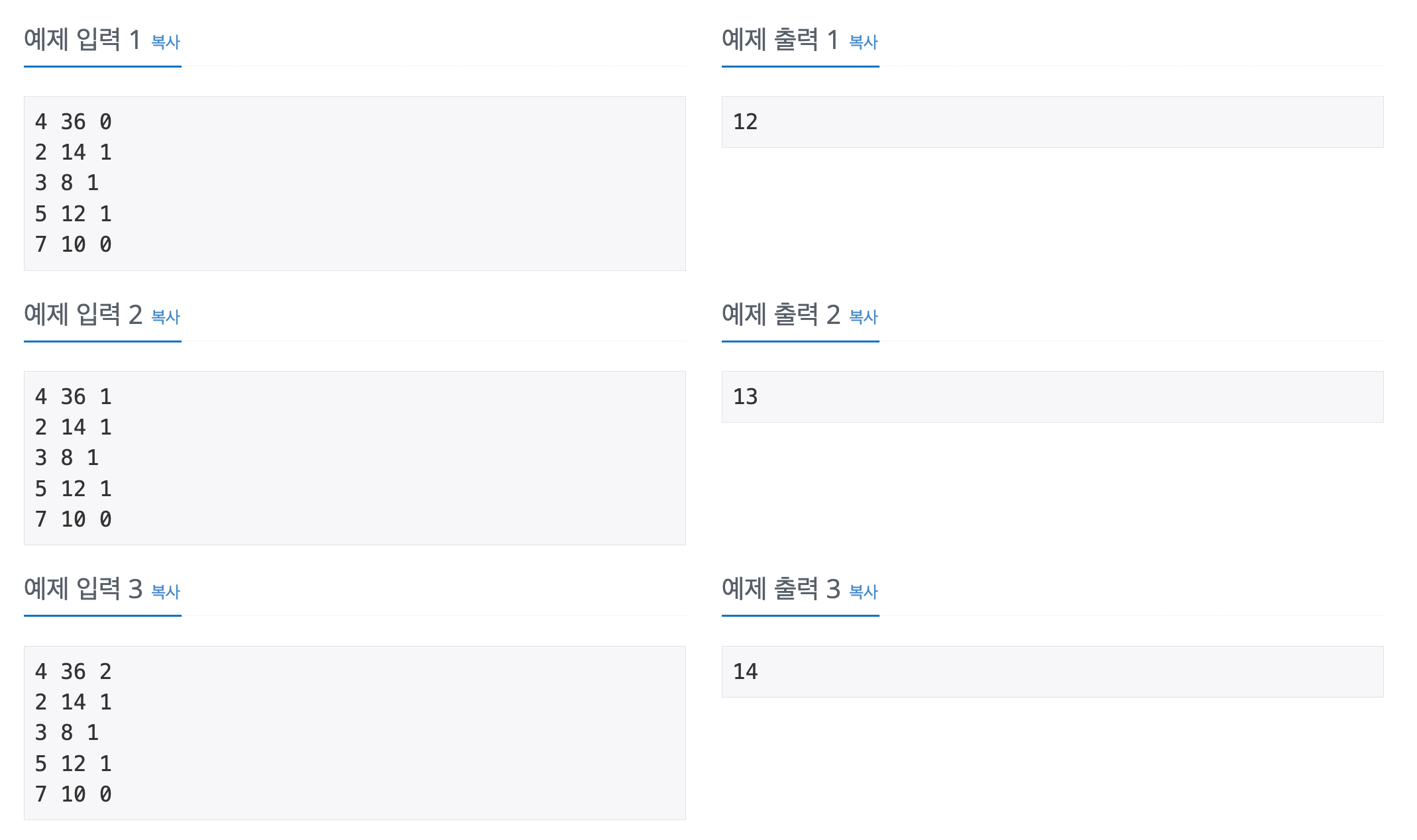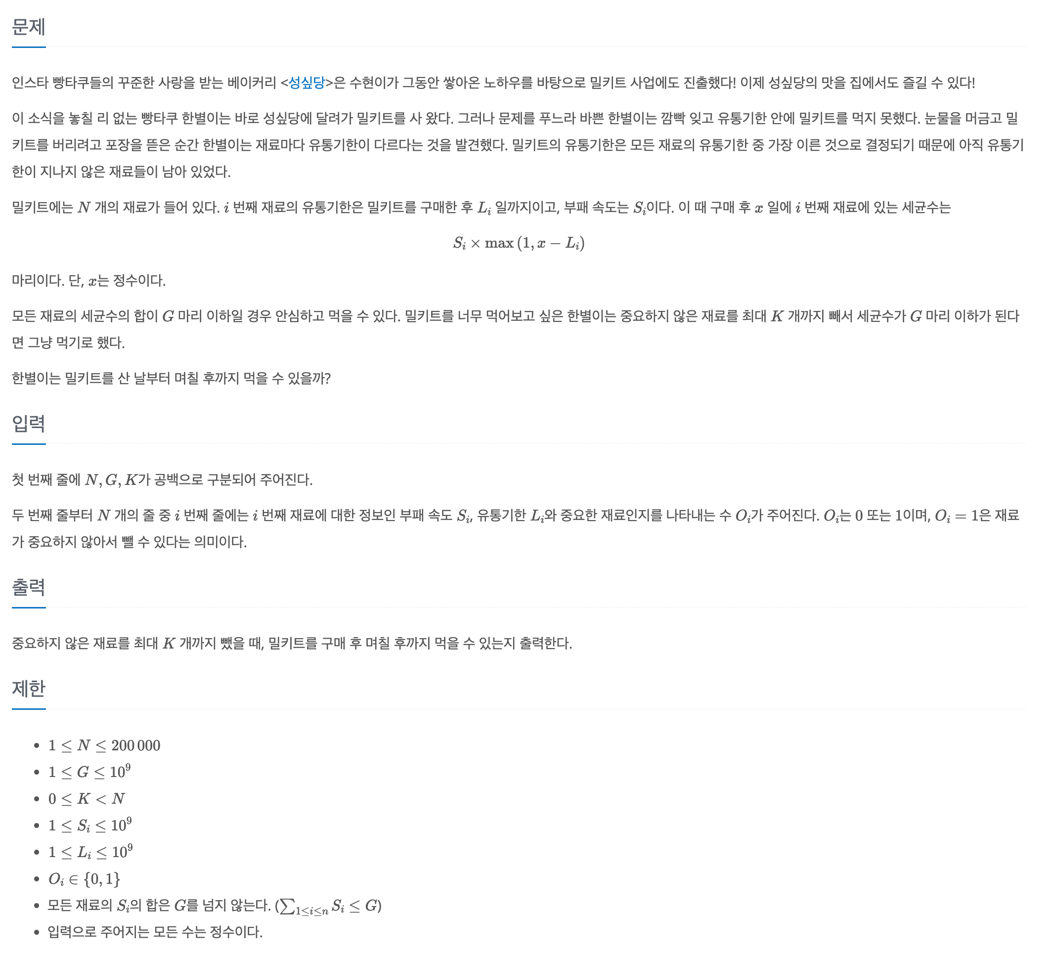 첫 번째 줄에 $N, G, K$가 공백으로 구분되어 주어진다. 두 번째 줄부터 $N$ 개의 줄 중 $i$ 번째 줄에는 $i$ 번째 재료에 대한 정보인 부패 속도 $S_i$, 유통기한 $L_i$와 중요한 재료인지를 나타내는