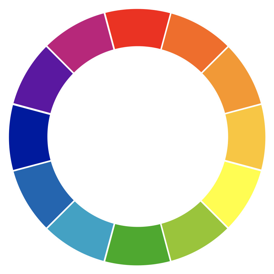 color wheel: 예술가들과 디자이너들이 색깔 사이의 관계를 시각화하기 위해 사용하는 도구로 세 가지 색 그룹으로 구성되어 있다: primary, secondary, teriary