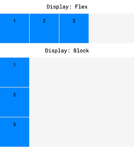 이전 예시에서 상위 컨테이너의 display value를 flex 또는 inline으로 변경했을 때 모든 하위 요소(flex item)가 상위 컨테이너의 왼쪽 상단 모서리로 이동했으며 이것이 플렉스 컨테이너와 해당 자식 컨테이너의 기본 동작이다.