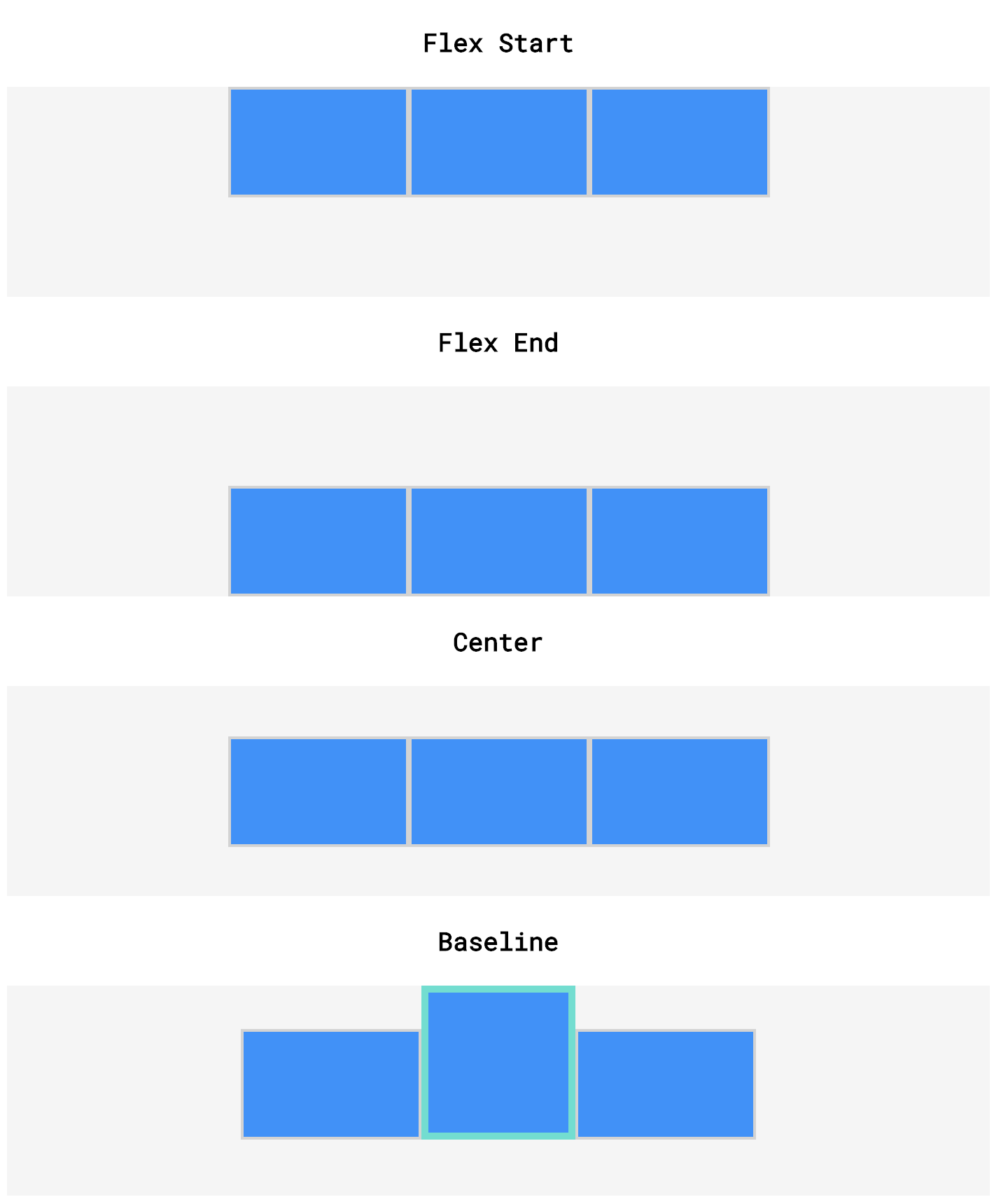 이 다섯 가지 값은 상위 컨테이너의 cross axis(교차 축)을 따라 작동하는 방법을 알려준다.