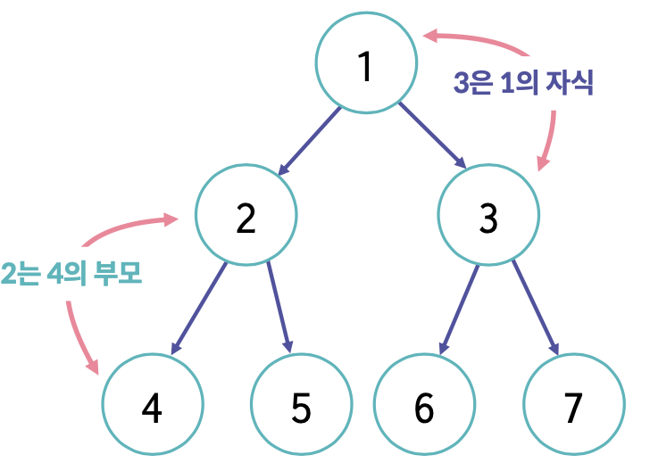 예를들어 정점 2는 정점 5의 부모노드이고, 정점3 은 정점 1의 자식노드이다.